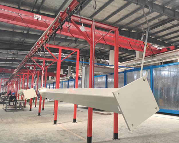 實施靜電噴塑時,關于此涂裝生產線上應注意被涂物件的裝掛。必須會預先通過試浸來設計掛具以及物件在涂裝生產線上的裝掛方式,保證工件在浸涂時候處于最佳位置。被涂物的最大平面應接近垂直,其他平面與水平呈10-40角,使余漆的涂裝面上能夠較流暢地流盡。